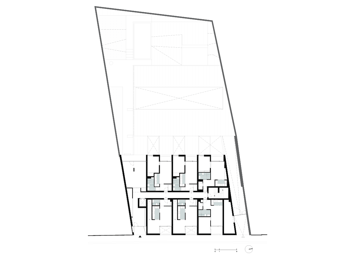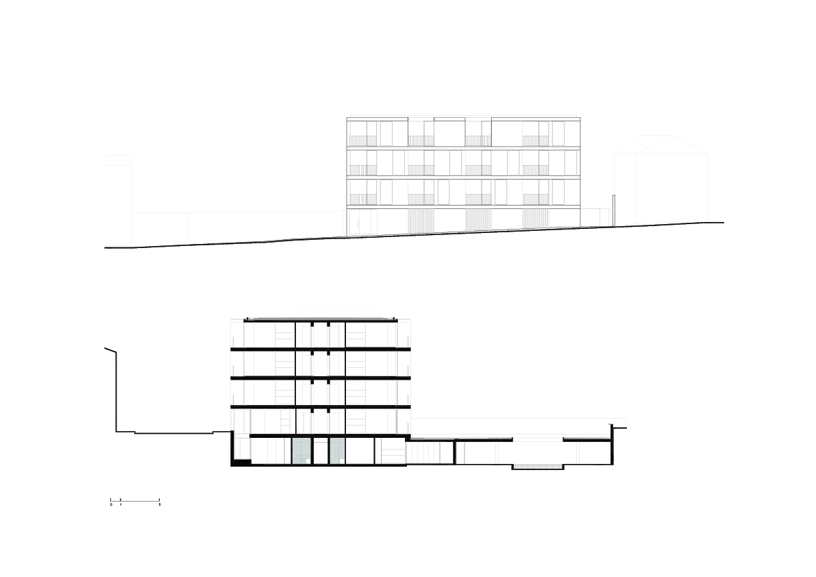 O projeto inclui 30 apartamentos — com varandas ou pátios ajardinados — parque de estacionamento subterrâneo, piscina, sauna e zonas técnicas, além de áreas verdes exteriores e coberturas ajardinadas que reforçam a integração paisagística e o conforto térmico.